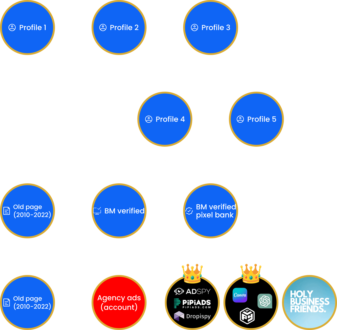 It comes with 6 profiles (which can be split in 2 different session so you can choose who from your team will have access to a specific profil), 2 verified BM (1 to host the agency account, 1 to creat the pixel and share it to the first one) and 2 old pages.